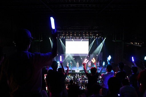 お次に登場したのは,月宮うさぎさんのカラフルな衣装が目を引いた,ULTRA-PRISM。1曲目の「ゼクス〜強い力〜」が始まると,会場は赤いケミカルライトで染まり,月宮さんが「みんな,飛んで!」と煽ると,観客もそれに応えるように盛り上がった。