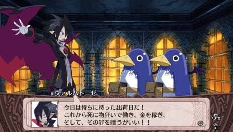 ゲームは「イベント」⇒「拠点」⇒「戦闘」の順に進行!イベントパートでは、主人公・ヴァルバトーゼを始めとする個性的なキャラクターたちの掛け合いを中心に物語が進行していく。物語が進み戦闘パートに行けるようになったら、拠点となる“地獄”で戦闘準備!“地獄”にある様々な施設では、武器や防具の購入やユニットの強化などが可能。仲間や装備が十分に整ったら、戦闘マップへと出撃しよう!