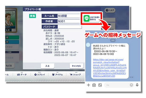 さらにアプリ「LINE」と連動して,MJモバイルでの対局の招待をLINE上で送れるようにしました。こちらはMJモバイルをダウンロードさえすればプレイヤー登録などの手続きをせずとも,招待URLからアクセスするだけでゲストとして即座に対局できる仕組みです。