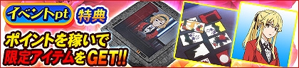 TVアニメ『賭ケグルイ××』の進化型SPキャラやアガリ演出のほか、卓背景アイテム等がイベントpt特典として獲得できます。