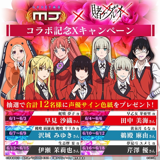 本キャンペーンにご参加いただいた方の中から、抽選で合計12名様にTVアニメ『賭ケグルイ××』豪華声優陣のサイン色紙をプレゼントします。ぜひご参加ください!