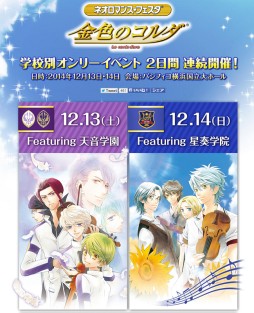 本イベントは、2012年に開催した「神南高校」にスポットをあてたイベント『ネオロマンス❤フェスタ 金色のコルダ Featuring 神南高校』と、2014年に開催した「至誠館高校」にスポットを当てたイベント『ネオロマンス❤フェスタ 金色のコルダ Featuring 至誠館高校』に次ぐ学校別のオンリーイベントです。「金色のコルダ3」シリーズに登場する「天音学園」と「星奏学院」のメインキャラクターたちが勢ぞろいし、ドラマやライヴなど、ボリューム満点のステージをお届けいたします。