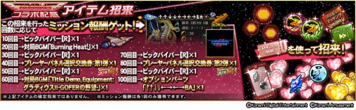 イベント期間中、アイテム招来を行った回数に応じたミッション開催!ミッションをクリアして対局BGM「Title Demo, Equipment:グラディウスII -GOFERの野望-」やオプションパーツ「↑↑↓↓←→←→BA」・ビックバイパー【R】をゲットしよう!