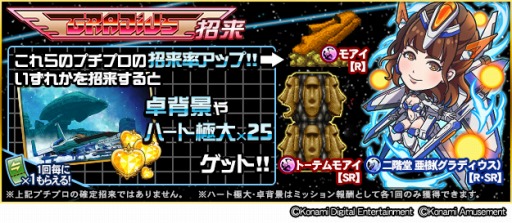 グラディウス招来にて二階堂 亜樹(グラディウス)【R・SR】・モアイ【R】・トーテムモアイ【SR】が復刻!さらに、上記のプチプロいずれかを招来すると、招来ミッションで卓背景「Destroy Them All」をゲットできます!
