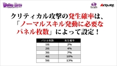 クリティカル攻撃は,ノーマルスキル発動時に一定確率で発生し,発動したノーマルスキルの威力が1.5倍になる。発生確率はノーマルスキル発動に必要なパネル枚数で変わり,それぞれ2/4/7/10/13%という設定になっている。また,これまではスタミナが10分に1回復する仕様だったが,これが3分に1回復する形に短縮される。