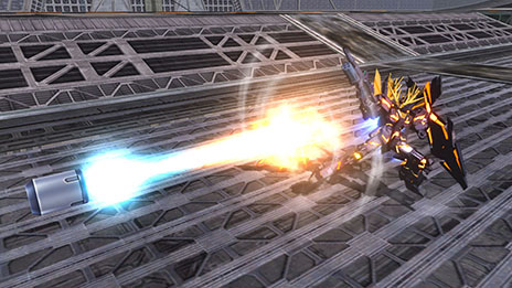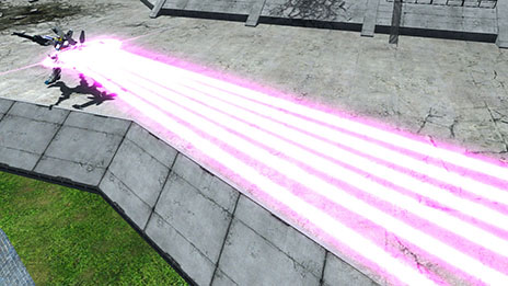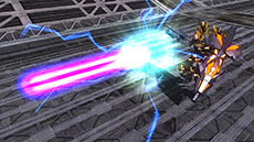 チャージ射撃はビームランチャーから照射ビームを発射。方向キー入力で軌道変更可能。EXバースト時は曲げられなくなるが、レールガン、機関砲との一斉射撃になる。