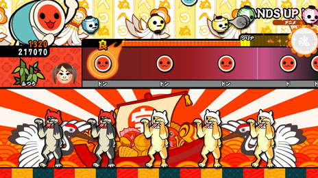 画面の右から流れてくる音符がワクに重なったら、太鼓を叩きます。タイミング良く太鼓を叩くと「魂ゲージ」が増えていき、演奏終了時に魂ゲージがノルマを越えているとクリアとなります。