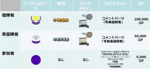 ・大会限定ノベルティは「エンブレムパーツ」、「称号」、「ゲージデザイン」、「コメントセット」、「GP」! 優勝者、準優勝者への限定ノベルティの他にも、参加者全員に大会限定ノベルティをプレゼント!!