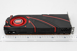 カード長は実測約278mm(※突起部除く)。HD 7970 GEリファレンスカードが同277mmだったので,ほぼ同サイズと言い切ってしまっていいだろう。付け加えると,GPUクーラーが基板の後方へ少しはみ出す格好になっている点も変わりなく,R9 290Xリファレンスカードの場合,基板自体の長さは270mmながら,GPUクーラーが8mmほどはみ出ていた。