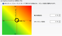 このドライバは,R9 290Xを差したシステムに導入すると,AMD OverDriveがアップデートされているのを確認できる。従来,「電力制限設定」と「GPUクロック設定」は個別になっていたが,R9 290Xではそれらがリンクし,横軸が電力制限,縦軸がGPUクロックの2次元マップから選択する格好になった。自己責任を覚悟すれば,このマップを使って,どの程度“無茶”なのかを色で判断しながら,OverDrive設定を行えるようになったわけである。