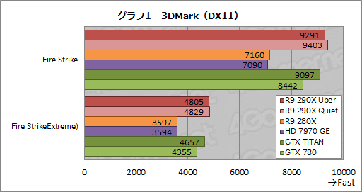 グラフ1は3DMarkの結果だが,R9 290X QuietはR9 280X&HD 7970 GEに対して30%以上高いスコアを示した。3DMarkではGCNアーキテクチャのRadeonがKeplerアーキテクチャのGeForceよりも高いスコアを出す傾向にあるので,驚くには値しないが,それでも,R9 290X QuietがGTX TITANより3〜4%程度,GTX 780より約11%高いスコアを示している点は目を引く。