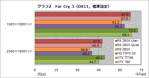 続いてグラフ2,3は「Far Cry 3」のテスト結果となる。まず,アンチエイリアシングとテクスチャフィルタリングを適用していない「標準設定」だと,R9 290X QuietはGTX 780の99〜105%というところに落ち着いた。TahitiコアのR9 280XやHD 7970 GEと比べると7〜21%程度高いスコアだ。