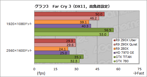 一方,4xアンチエイリアシングと16x異方性フィルタリングを適用した「高負荷設定」だと,R9 290X QuietはGTX 780の87〜92%程度。Far Cry 3は高負荷設定になるとGeForceがスコアを伸ばすのだが,その傾向はR9 290Xの512bitメモリインタフェースをもってしても打破できないようだ。