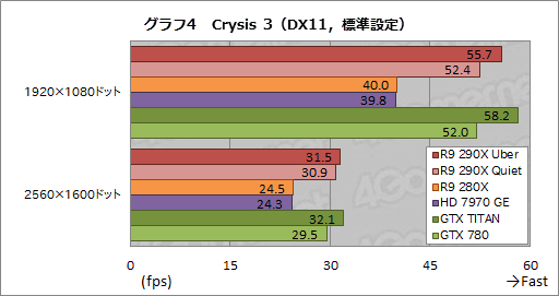 一方,このクラスのGPUにとって,より現実的なグラフィックスプリセットとなる最高品質だと,R9 290X QuietはGTX 780と互角の勝負に持ち込んでいる。Crysis 3と同様に,極めて広いメモリバス帯域幅がその要因だろう。