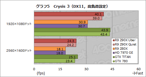 そこで今回は「Ultra設定」のスコアを見ることになるが,ここではR9 290X Quietのスコアがあまり振るわない。2560×1600ドットで,対GTX 780のスコアは約92%だ。