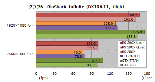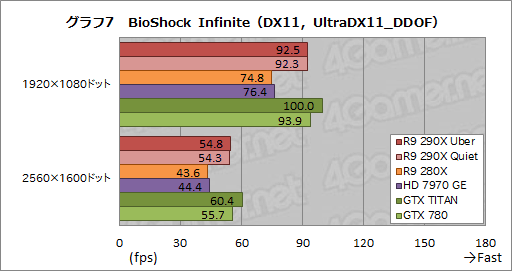 Radeonに最適化されたタイトルとして知られる「BioShock Infinite」のスコアがグラフ6,7だが,ここでR9 290X QuietはGTX 780比で97〜99%程度のスコアとなった。R9 290X Uberは「High」プリセットでGTX 780を上回るものの,「UltraDX11_DDOF」プリセットで逆転を許しており,全体としてはFar Cry 3と似た傾向に見える。