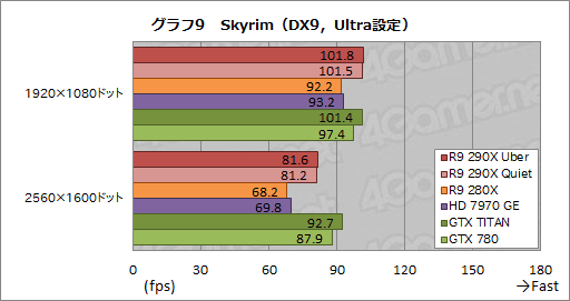 グラフ8,9は「The Elder Scrolls V: Skyrim」(以下,Skyrim)のテスト結果となる。公式の高解像度テクスチャパックを導入済みとはいえ,このクラスのGPUにとってSkyrimの負荷はもはや低すぎるため,標準設定ではR9 280XとHD 7970 GEを除く4製品で,CPUボトルネックによるスコアの頭打ちが生じてしまった。