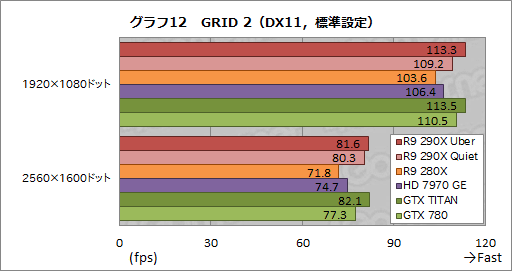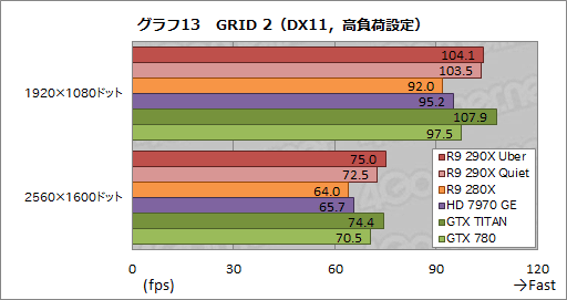 性能検証の最後は初登場となるGRID 2だが,グラフ12,13を見るに,R9 290X Quietのスコアは良好だ。標準設定の1920×1080ドットではCPUボトルネックによると思われるスコアの頭打ちが見られるものの,それ以外のテスト条件だと,R9 290X Quietは安定的にGTX 780のスコアを上回った。R9 290X Uberが高負荷設定の2560×1600ドットでGTX TITANを逆転している点も押さえておきたい。