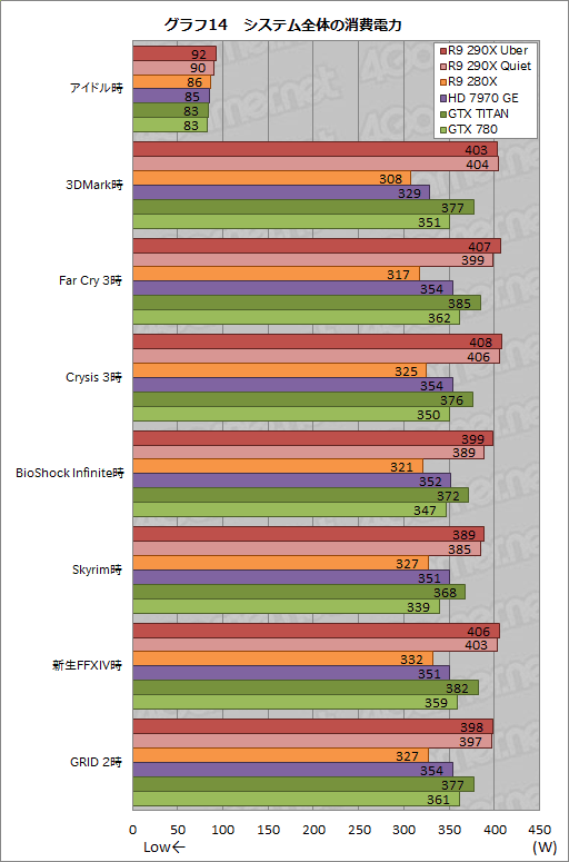 その結果がグラフ14で,なんといっても注目は,アプリケーション実行時におけるR9 290X QuietのスコアがGTX TITANより14〜30W高いことだ。ワンビッグチップの“モンスター路線”は久しくNVIDIAの専売特許だったが,R9 290XでAMDが戦場に帰ってきた,といったところか。