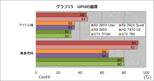 当然のことながらGPUクーラーもファン回転数の制御方法も,果ては温度センサーの位置もカードごとに異なるので,厳密な横並びには使えない。その点はくれぐれも注意してほしいが,それでも,R9 290X QuietとR9 290X Uberのスコアが完全に抜けた数字になっているのは一目で分かるだろう。