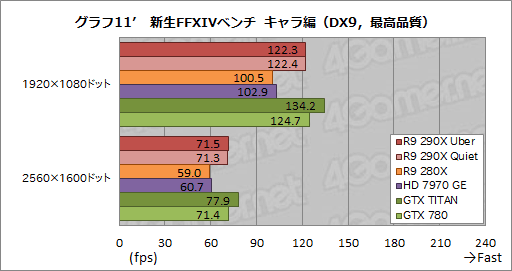 新生FFXIVベンチ キャラ編のスコアをまとめたものがグラフ10,11である。標準品質(デスクトップPC)の負荷は,このクラスのGPUからするとさすがに低く,結果,2560×1600ドットでもR9 290X Quietは15000超のスコアを示している。ただ,冷静にGTX 780と比較すると,95〜96%程度に留まっているのも確かだ。