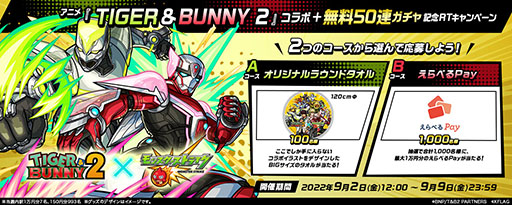 モンストキャンペーン公式Twitterアカウント( https://twitter.com/monst_campaign )が投稿する対象ツイートを期間内にリツイートすると、 ここでしか手に入らない限定グッズ「『TIGER & BUNNY 2』×モンストオリジナルラウンドタオル」や、 さまざまなスマホ決済サービスのポイントを自由にえらべる「えらべるPay」が抽選で当たります。