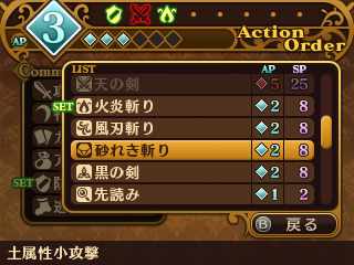 ゲーム序盤で入手できる特技スキル「先読み」を使うと、バトル終了まで敵の行動をアイコンで見ることができる。攻撃を封じたり、隙を突いてHPを回復したりと、より戦略的に効率よく戦うヒントとなる。
