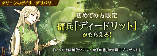 豪華な「アリエンのデイリーデリバリー」を本日より開催しております。 ログイン1日目には、 通常は大金貨でしか交換することのできない「レベル上限解放クエスト完了の書」が誰でも獲得可能となり、 またイベント期間中に初めて『ロードス島戦記オンライン』をプレイされた方につきましては、 「ディードリットの傭兵雇用の契約書」を追加で獲得することが出来ます。