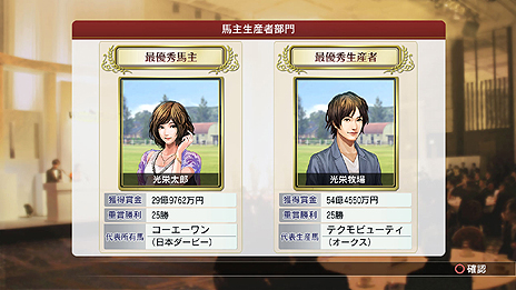 プレイヤー自身が最優秀馬主、プレイヤーの牧場が最優秀生産者を受賞したシーンです |