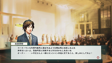 所有馬コーエーワンが年度代表馬に選出された際、主戦騎手を務める息子・光栄直樹が、翌年の凱旋門賞への挑戦を申し出るシーンです |