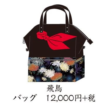 飛鳥のバッグは、飛鳥が首元に付けているスカーフを取手に結びつけた様なデザインになっています。中の裏地には大好物の太巻きをプリントし、ショルダーでもリュックでも持てるバッグです。