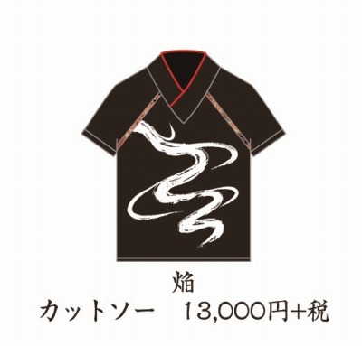 焔のカットソーは、筆書きで焔の長い髪の毛のイメージをプリントした着物衿のカットソーです。後には彼女の武器である太刀をグラフィカルにプリントしました。