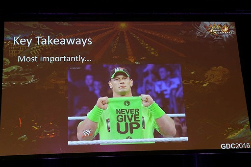 それは「優れたローカライズは,その国のゲームのように感じてもらえる」「ローカライズマネージャーは,地域を超えて利益を挙げる指針になる」「職場の仲間と協力していく以外に方法はない」「一足飛びの変更ではなく,計測可能な部分に目を向ける」というものだ。そして最後に,「ともあれ絶対にあきらめないこと」という知見を述べて,レクチャーを締めくくった。ローカライズマネージャーにここまでの権限を与えているメーカーがほかにあるのかは分からないが,「モンスターハンター」を世界のゲーマーに広めるために奮闘する,若いAlfonso氏の姿が印象的なレクチャーだった。