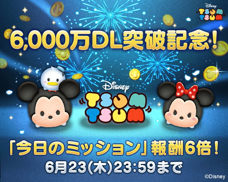 「LINE:ディズニー ツムツム」の世界累計DL数が6000万件を突破。デイリーミッションの報酬が通常の6倍になるイベントを6月23日まで開催