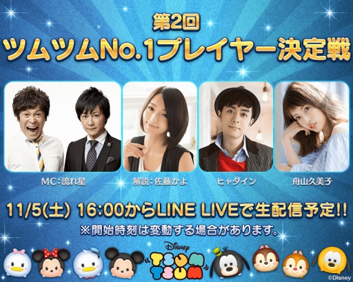 「ディズニー ツムツム」,11月5日に開催される「第2回ツムツムNo.1プレイヤー決定戦」決勝大会をLINE LIVEで配信。ヒャダインさんらがゲスト出演
