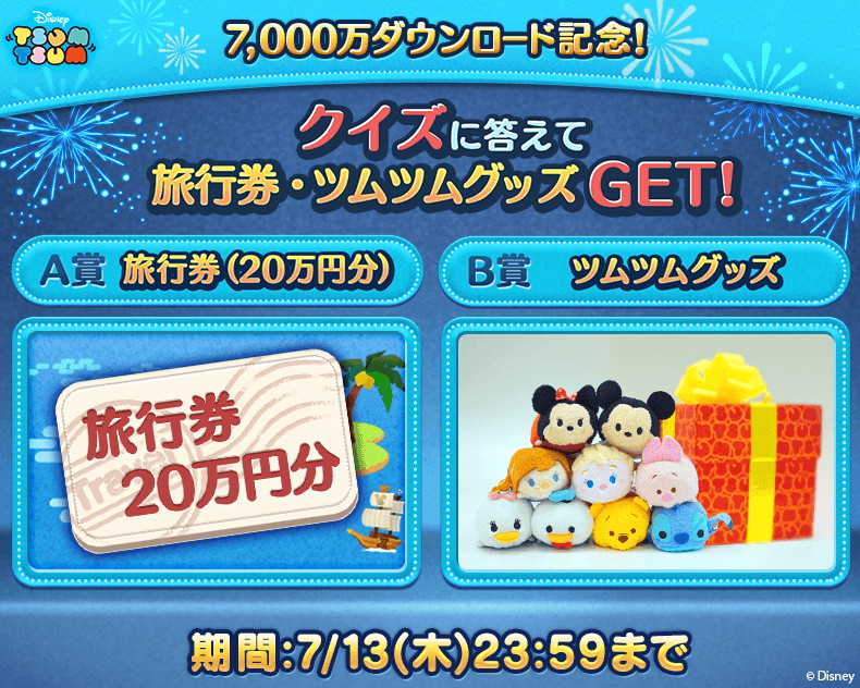「LINE:ディズニー ツムツム」の世界累計DL数が7000万を突破。旅行券(20万円分)やグッズが抽選でもらえるTwitterキャンペーンが開催中