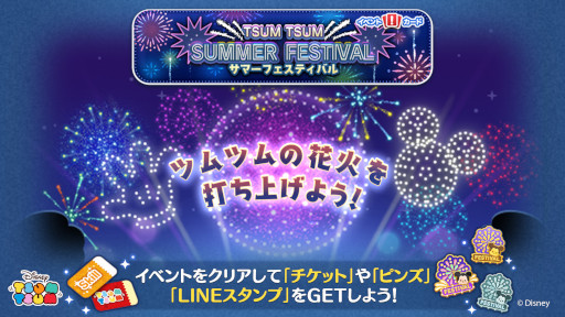 また8月4日(木)より、ミッションをクリアしてイベント会場を飾りつけてツムツムの花火を打ち上げるイベント「TSUM TSUM SUMMER FESTIVAL」を開催します。ミッションをクリアすると、限定ピンズや夏がテーマのツムツムオリジナルデザインのLINEスタンプがもらえます。