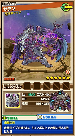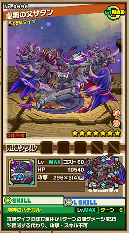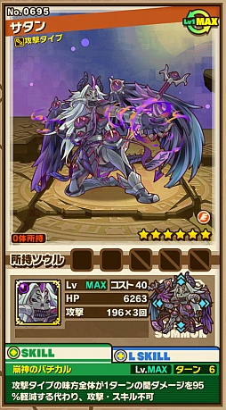 「底なしの淵」をクリアすると,「サタン」が手に入ることがある。その進化後である「虚無の父サタン」は,攻撃タイプの味方が3コンボ以上で攻撃力が3.2倍になるというリーダースキルに加え,攻撃タイプの味方全体が1ターンの間ダメージを95%軽減する代わりに,攻撃/スキルが使用不可になるというスキルを持っている。