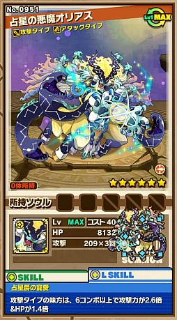 「占星の悪魔オリアス」は,攻撃タイプの味方が6コンボ以上で攻撃力2.6倍&HP1.4倍になるというリーダースキルに加え,十字列にいる攻撃タイプの味方の攻撃力を2ターンの間3倍にするというチェーンスキルを持っている。