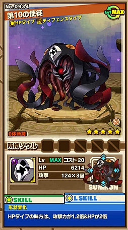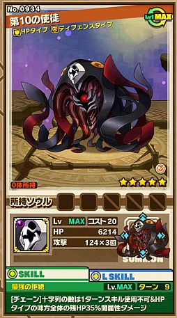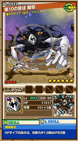 「攻防、ジオフロント」をクリアすると,「第10の使徒」が手に入ることがある。その進化後である「第10の使徒 擬態」は,HPタイプの味方の攻撃力が1.5倍&HPが2倍になるというリーダースキルに加え,十字列の敵は1ターンスキル使用不可&HPタイプの味方全体の残HP35%闇属性ダメージを与えるというチェーンスキルを持っている。