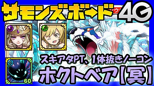 「ノーザモ流氷山」をクリアすると,「ホクトベア」が手に入ることがある。その進化後である「氷塊獣ホクトベア」は,攻撃タイプの味方の攻撃力が2.3倍&水属性の味方のHPが1.5倍になるというリーダースキルに加え,縦一列の攻撃タイプの味方と共に後方向へ攻撃力20倍ダメージで突撃するというチェーンスキルを持っている。