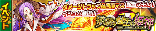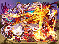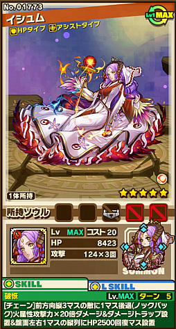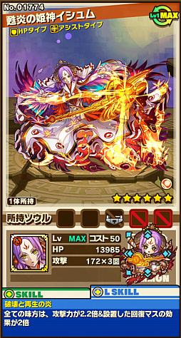 「灼炎の聖堂」をクリアすると,「イシュム」が手に入ることがある。その進化後である「甦炎の姫神イシュム」は,すべての味方は攻撃力2.2倍&設置した回復マスの効果が2倍になるというリーダースキルに加え,前方向3マスの敵に1マス後退(ノックバック)火属性攻撃力20倍ダメージ&ダメージトラップ設置&盤面左右1マスの縦列にHP2500回復マス設置するというチェーンスキルを持っている。