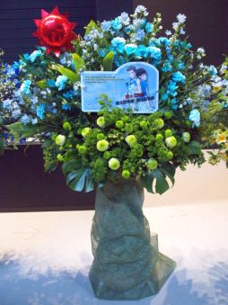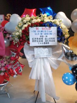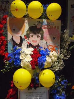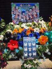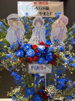 続いて,ハートがスクリーンに映し出されたということで,F-LAGSの新曲「♡Cupids!」が12曲め。待ってたよ!! ステージ上にハートがいっぱい映し出されて,可愛らしい演出が楽しめました。背中を向けた3人がプロデューサー達をちらちらと見ていたりといった振り付けがあり,恋する女の子な仕草をイメージしているのかも? また,徳武さんと浦尾さんが腕を伸ばして作った大きなハートのなかに三瓶さんが顔を覗かせると,大きな歓声が。白状しますが,わたしも叫んだ。最後は,手袋を三瓶さんが外したかと思うと,3人で背を向け両手を背中でパタパタさせていて……ありがとう,F-LAGSキューピット……。射抜かれました!