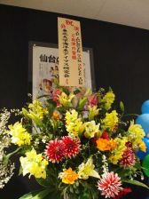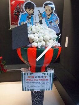 可愛らしいステージが終わると,今度は汽笛の音が! 6曲めは,F-LAGSの「夢色VOYAGER」です。前回,幕張ではトロッコに乗って登場したため,でべそで歌うことがなかったF-LAGSですが,今回はでべそで旗を振っていて,サイコー! 距離が近く感じられて,食い入るように見てしまいました。浦尾さんは,今回も「わしらが」と歌詞をアレンジ! さらに「笑わせるぜ! 仙台!」と続けると,大きな歓声があがっていました。さらに,途中からは神速一魂の2人が大きな旗を持ってステージ上に登場し,5人で旗を振りながらパフォーマンス! 最後は「ST@RTING LINE」のジャケットと同じポーズでしめました。