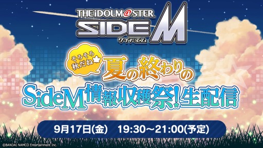 株式会社バンダイナムコエンターテインメントは、「アイドルマスター SideM」の最新情報をお届けする生配信「アイドルマスター SideM そろそろ秋だね 夏の終わりのSideM情報収穫祭!」を、9月17日(金)19:30より配信予定であることをお知らせいたします。是非ご覧ください!