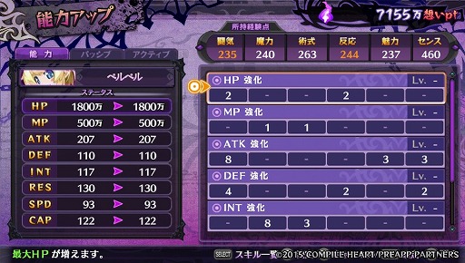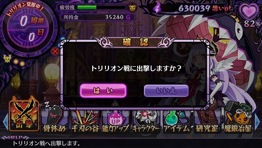 この育成パートでは,どれもこれもと欲張って強化しようとすると経験点が足りず,中途半端な能力のままトリリオンと戦うハメになるので,しっかりと計画を立てて魔王を鍛えていきたいところ。どのパラメータも重要だが,もし迷ったときには魔王の行動速度を高める「SPD」を上げておくといいだろう。SPDを上げるとトリリオンの攻撃ターンを遅らせることができるので,優先的に鍛えておくと,多少なりとも生き残れる可能性が高くなる……かもしれない。