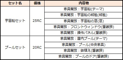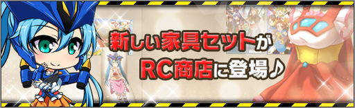 2020年9月3日(木)定期メンテナンス後から、RC商店に新たな家具セットを追加いたしました。購入したセットを倉庫にて開封後、自室の家具リストにて、それぞれの家具解放アイテムに対応した家具を選択すれば、設置が可能になります。