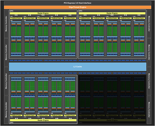 シェーダプロセッサ「CUDA Core」32基をひとかたまりとして,8基のロード/ストアユニットと8基の超越関数ユニット,1基の「Warp Scheduler」(スケジューラ),2基の命令実行ユニットなどと組み合わせて1ブロックとし,これを4基まとめたうえでジオメトリエンジン「PolyMorph Engine 4.0」とL1キャッシュ,8基のテクスチャユニットなどとセットで演算ユニット「Streaming Multiprocessor」(以下,SM)を構成する仕様は,上位モデルと完全に同じ。もちろん,5基のSMごとに1基のラスタライザ「Raster Engine」を与えてミニGPU的な「Graphics Processing Cluster」(以下,GPC)とする点も変化はない。