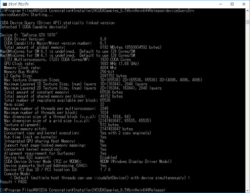 フルスペックから一部を削った「7」系と聞くと,「GeForce GTX 970」(以下,GTX 970)の「グラフィックスメモリ3.5GB問題」を連想する読者がいるかもしれないが,CUDAの開発キットに付属する,CUDAデバイスの能力を調べるためのツール「DeviceQueryDrv.exe」を実行してみても,L2キャッシュ容量とROPユニット数はGTX 1080と同じだった。