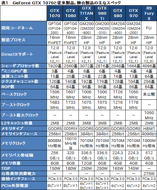 そんなGTX 1070の主なスペックを,ここまで名前が挙がったGTX 1080とGTX 980,GTX 970のほか,第2世代Maxwellのトップエンドモデル「GeForce GTX TITAN X」およびその下位モデル「GeForce GTX 980 Ti」,そして,競合の最上位モデルとなる「Radeon R9 Fury X」と比較したものが表1である。